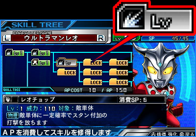 - [1] 所持している150APより10APを消費して、スキル「レオチョップ」を修得。続けて30APを消費して、スキル「レオチョップ」のレベルを1から2に強化。