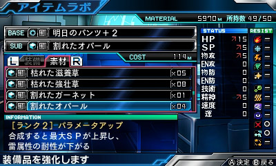 [1] 既に合成・強化済みの装備アイテム「明日のパンツ+2」とランク2の素材「割れたオパール」を合成させて…